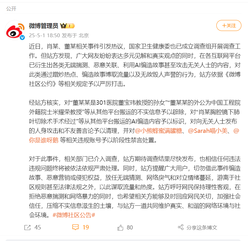 5月1日,微博管理员发布公告:近日,肖某、董某相关事件引发热议,国家卫生健康委也已成立调查组开展调查工作。但站方发现,广大网友纷纷表达多元见解和真实观点的同时,在各互联网平台已衍生出各类无端揣测、恶意