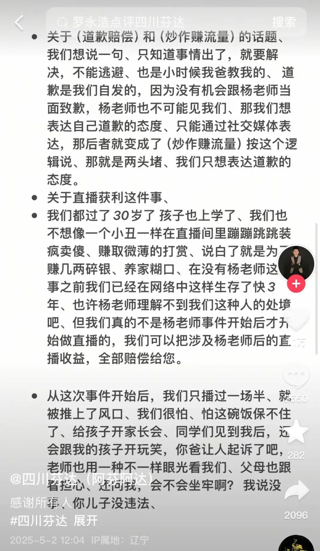 5月2日,被杨坤起诉的网红“四川芬达”发布声明,再次向杨坤道歉,“我们哥俩不是网络施暴者,我们只是您的模仿者而已,从来没有诋毁过您,内心是非常尊重您的”。“四川芬达”称,以往视频有冒犯到杨坤老师希望他