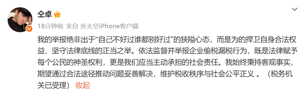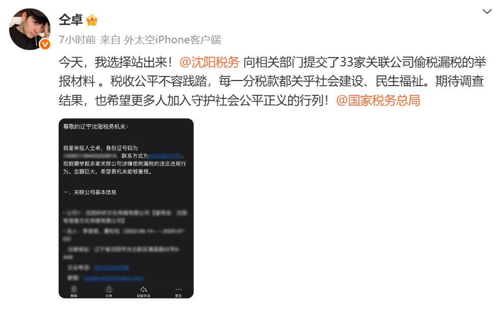 4月29日,演员仝卓发布微博实名举报33家关联公司偷税漏税:“今天,我选择站出来!向相关部门提交了33家关联公司偷税漏税的举报材料。税收公平不容践踏,每一分税款都关乎社会建设、民生福祉。期待调查结果,