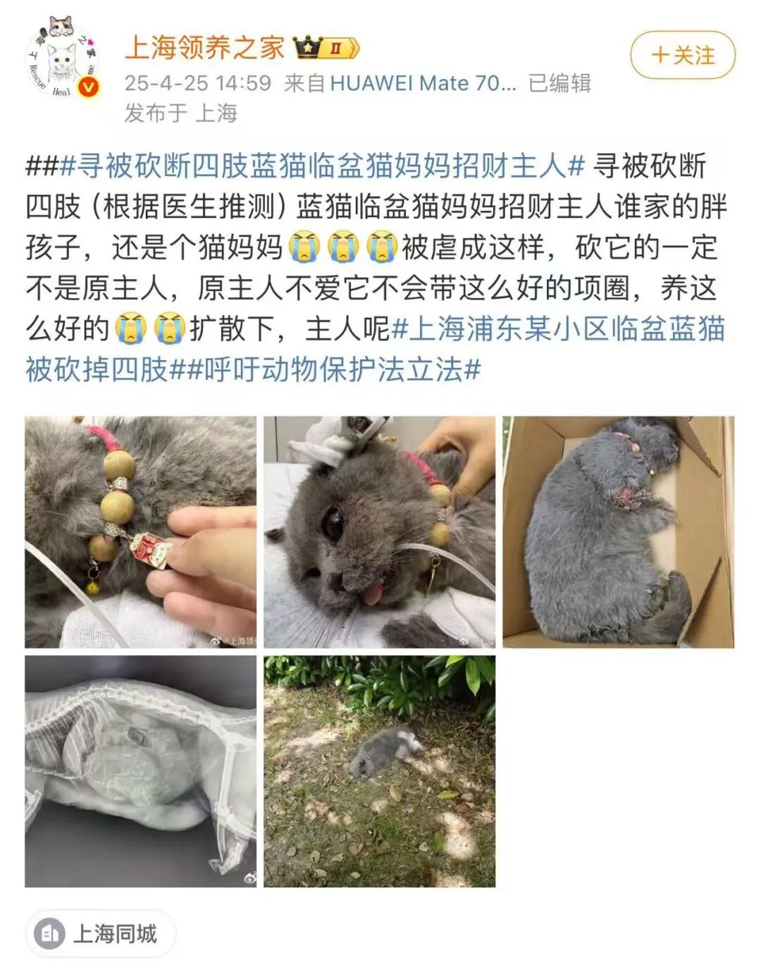 4月25日百万粉丝博主“上海领养之家”发文称上海市浦东新区莲溪路地铁站附近一小区东门草坪上发现一只怀孕蓝猫疑遭受虐待被砍断四肢送医抢救后死亡当天上午10时46分,该博主发文称,莲溪路地铁站附近有蓝猫疑