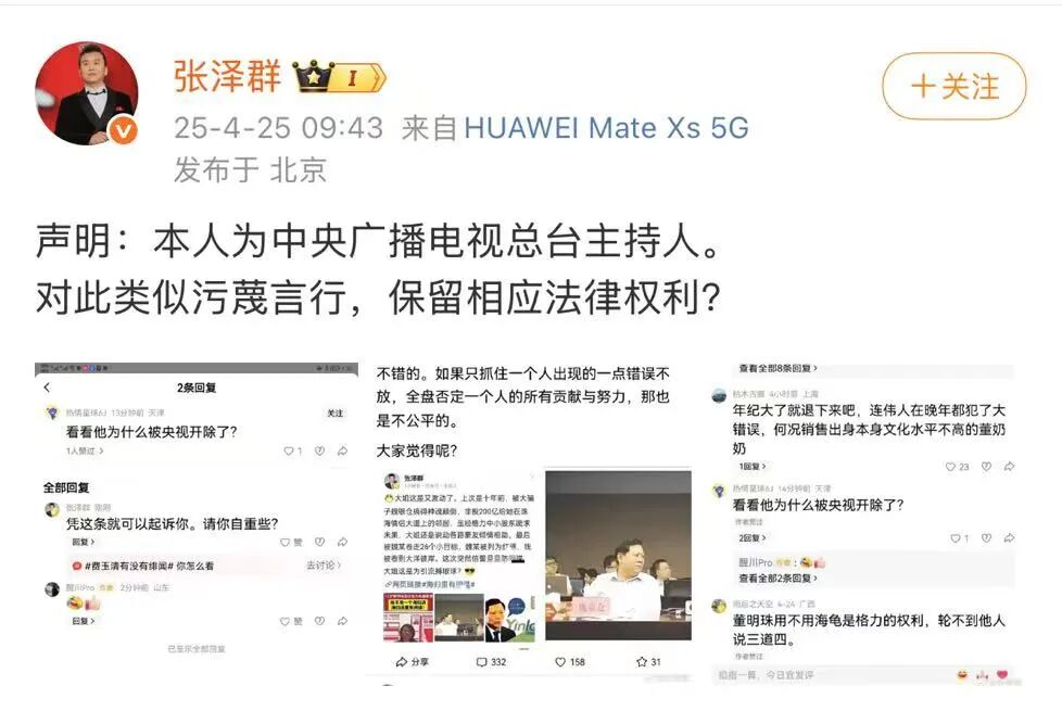 近日,有网友称主持人张泽群被央视开除,4月25日,张泽群愤怒发文反驳。张泽群写道:“声明:本人为中央广播电视总台主持人。对此类似污蔑言行,保留相应法律权利?”张泽群晒出的截图显示,有网友在评论区称:“
