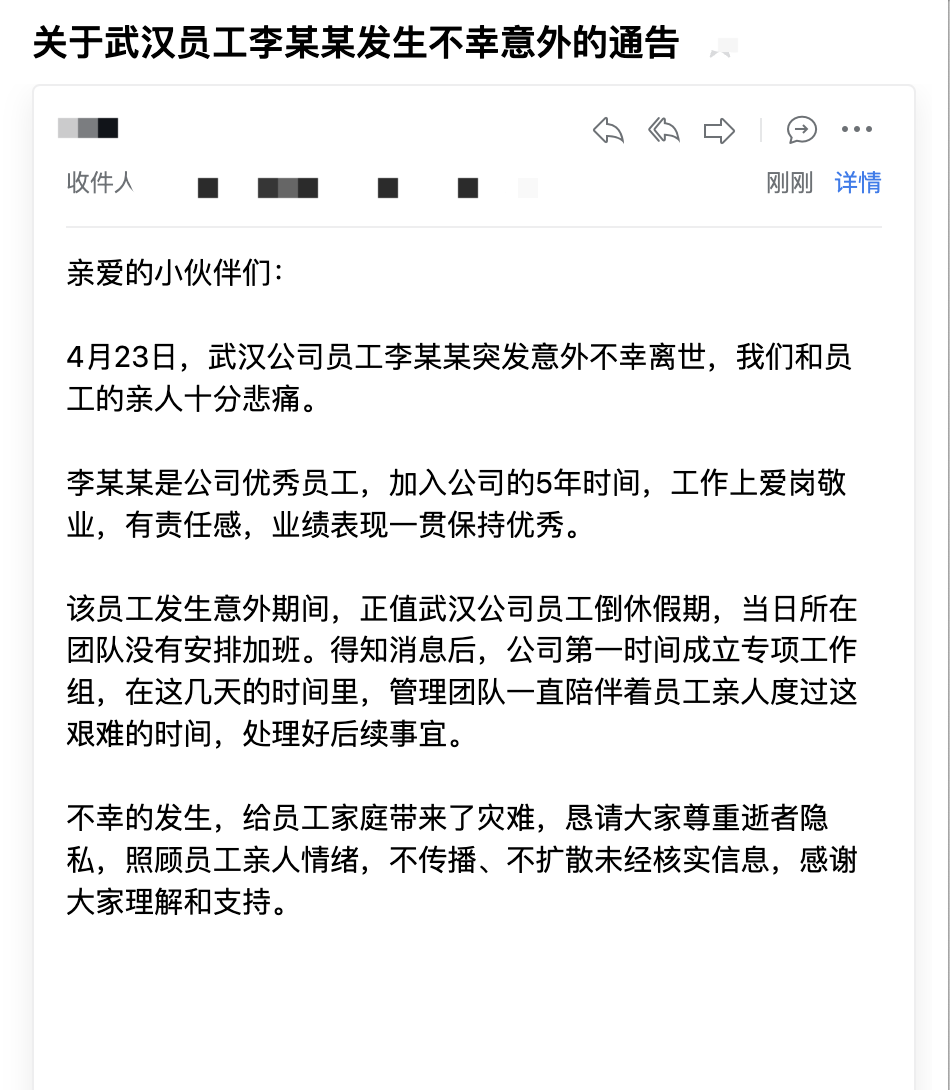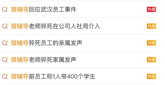 多家媒体近日报道猿辅导武汉公司一员工在公司猝死多个话题冲上热搜:25日,猿辅导方面证实其武汉公司员工李某某突发意外不幸离世。猿辅导称,李某某是公司优秀的员工,该同事发生意外期间,正值武汉公司员工倒休假