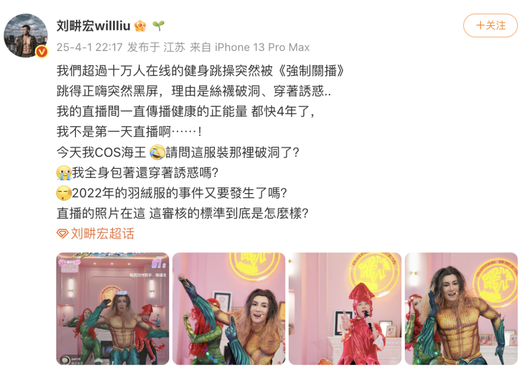 4月1日,6000万粉丝的艺人兼健身博主刘畊宏直播时打扮成海王,被强制下播。事后,刘畊宏发文称,“我们超过十万人在线的健身跳操突然被强制关播,理由是丝袜破洞、穿着诱惑。”“请问这服装哪里破洞了,我全身