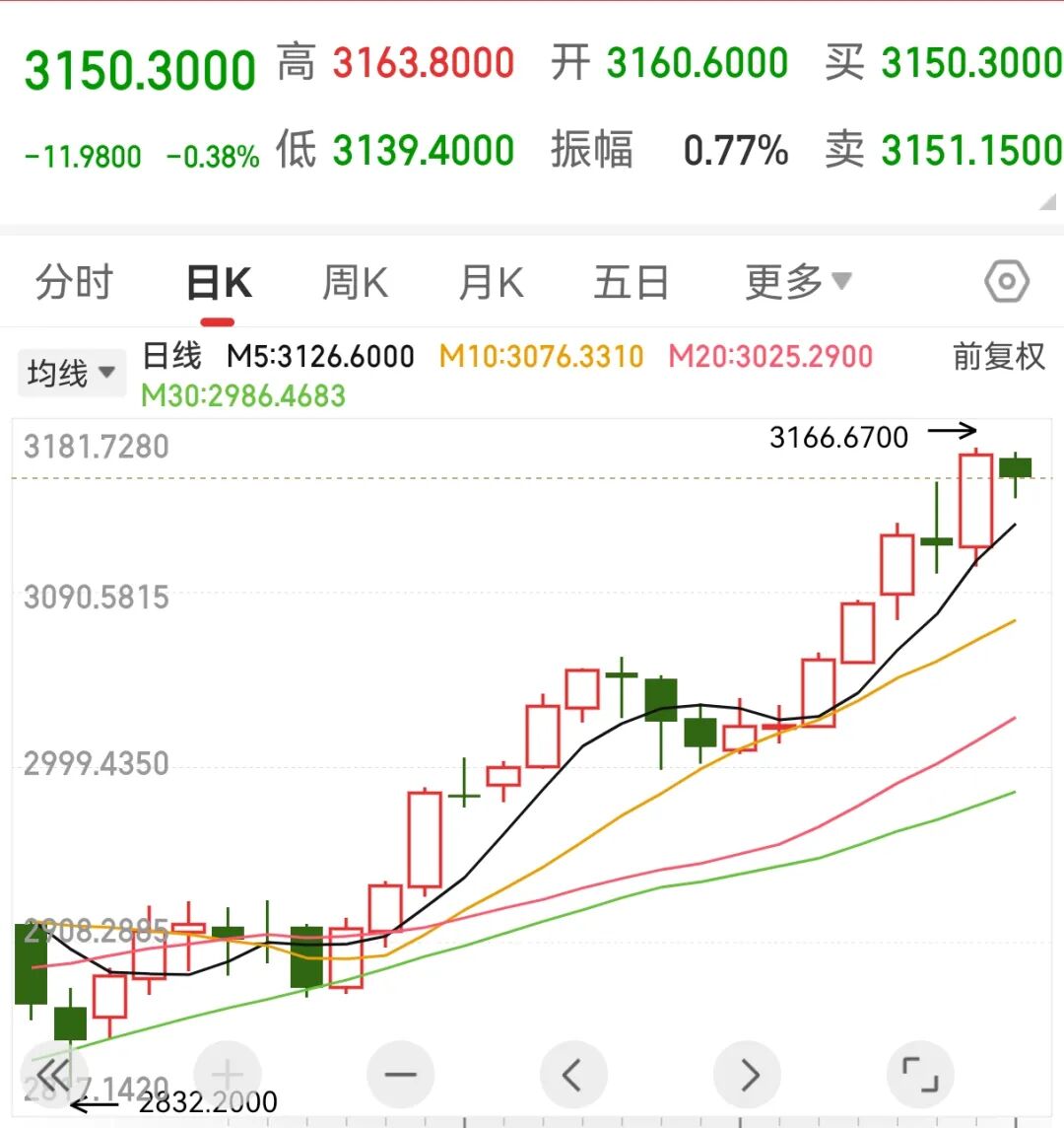 北京时间4月3日,伦敦现货黄金升破3150美元/盎司关口,继续创历史新高,截至3日7时50分左右,报3166.67美元/盎司。图片来源:同花顺3日早间,#金价冲向1000元#话题登上微博热搜榜榜首,引