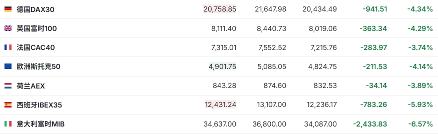 “对等关税”冲击波持续发酵,全球市场迎来无眠之夜。4月4日晚间,美股开盘之后,继续开启暴跌模式。4月5日,美股三大指数大幅收跌,标普500指数跌5.97%,创2020年3月以来最大单日跌幅;本周收跌9