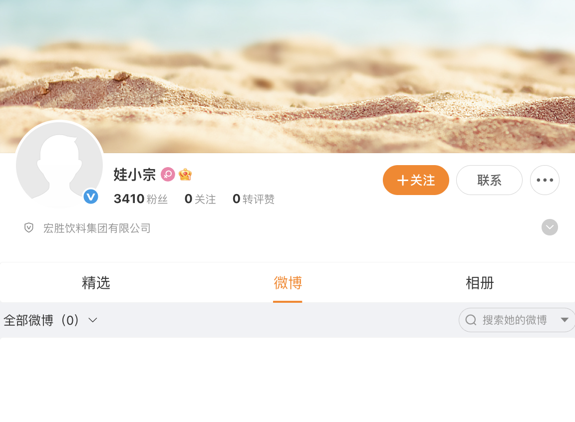 10月11日,一个名为“娃小宗”的微博账号已完成平台认证。检索信息显示,该账号认证主体为宏胜饮料集团有限公司,审核通过时间为9月30日,目前粉丝数3410,暂未发布任何内容。宏胜集团是恒枫贸易有限公司