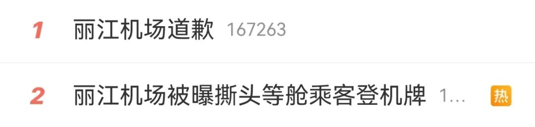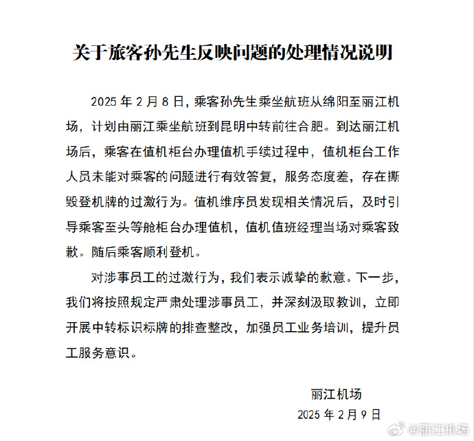 2月9日,一博主发布视频称,其在云南丽江三义国际机场转机时与值机员发生口角,值机员撕掉其登机牌。在网上引起热议。2月9日晚,丽江机场发布情况说明,相关话题冲上热搜。2月9日晚,@丽江机场 发布关于旅客