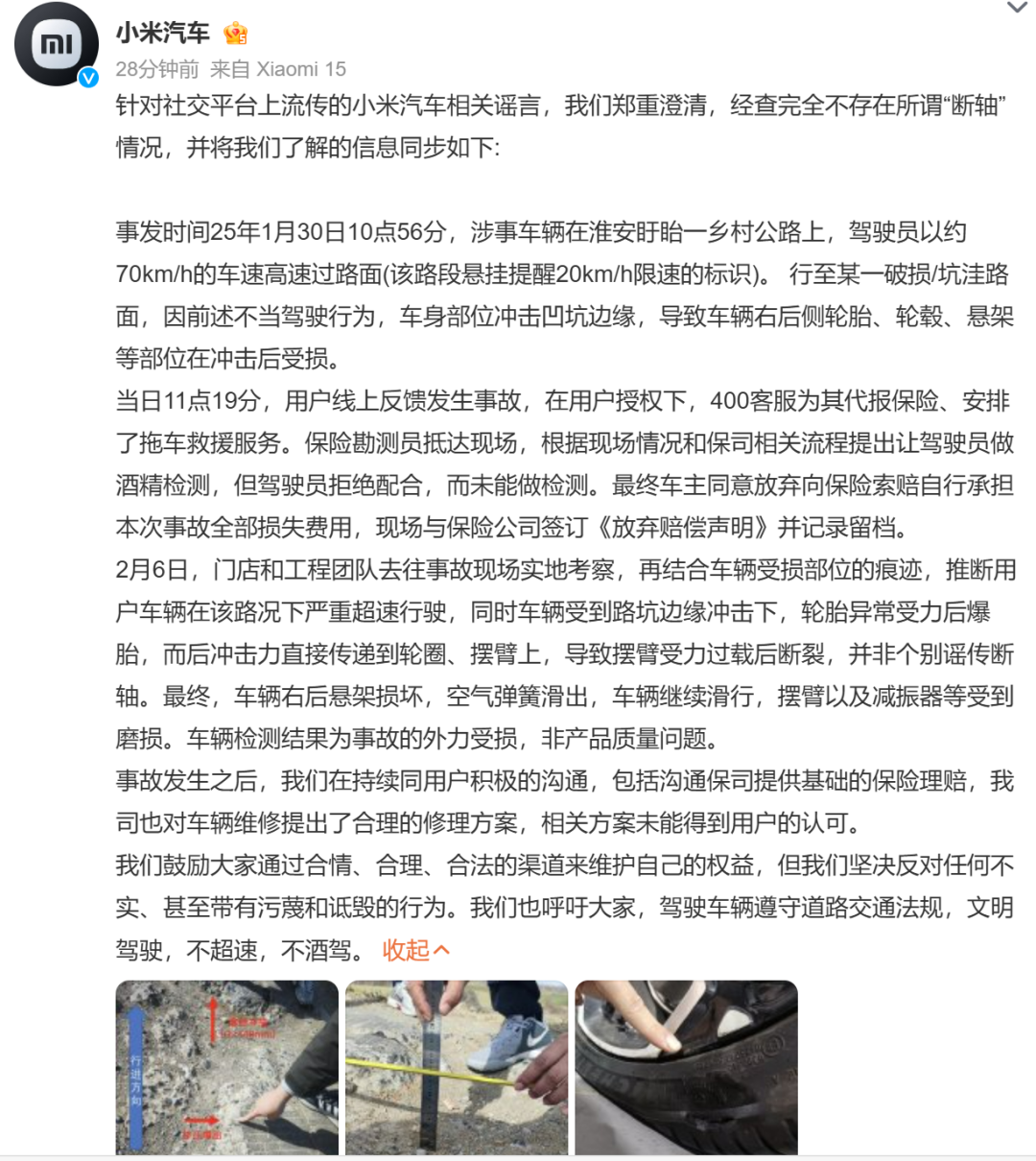 小米汽车官方微博今日(2月9日)发文:针对社交平台上流传的小米汽车相关谣言,我们郑重澄清,经查完全不存在所谓“断轴”情况,并将我们了解的信息同步如下:事发时间25年1月30日10点56分,涉事车辆在淮
