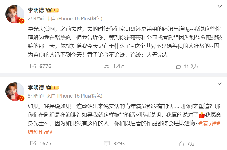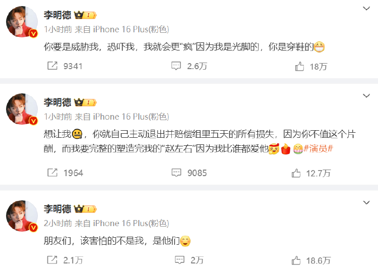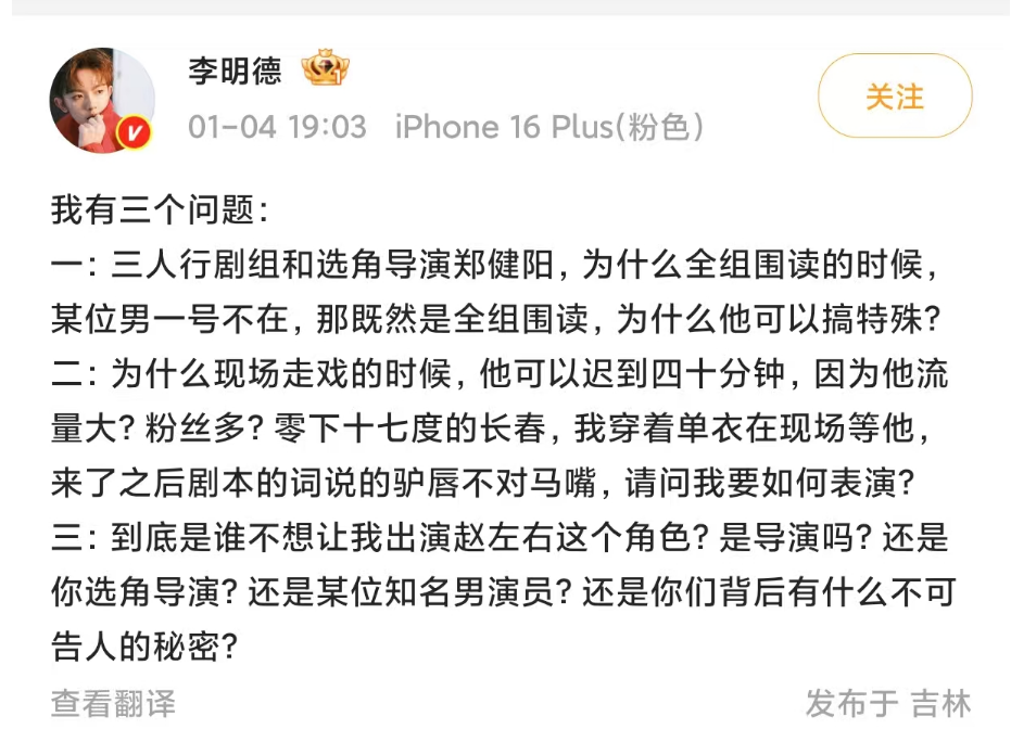 1月4日下午,男演员李明德发博称电视剧《三人行》剧组搞区别对待,并控诉马天宇耍大牌,相关话题爆上热搜第一,引发网友关注。李明德接连发文李明德发文向电视剧《三人行》剧组提出三个疑问,称全组围读的时候男一