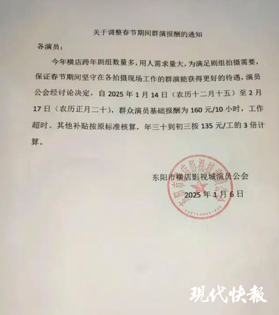1月7日,浙江东阳横店影视城演员公会在其社媒账号发布文章,称将在春节期间针对群众演员基础报酬进行调薪,调整后的薪资为160元/10小时。记者就此事向东阳横店影视城演员公会以及多位横店群演求证,该通知内