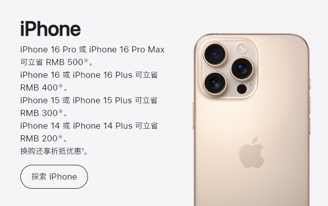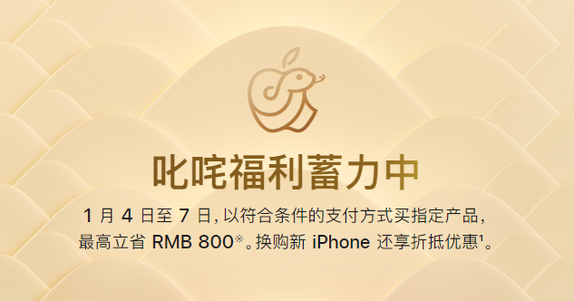 2025刚开始,苹果中国官网公布了“叱咤福利”新年促销活动,将于1月4日至7日开启。活动期间,以符合条件的支付方式购买指定商品,每位顾客每个产品类别限购2件,最高立省800元人民币,换购新iPhone