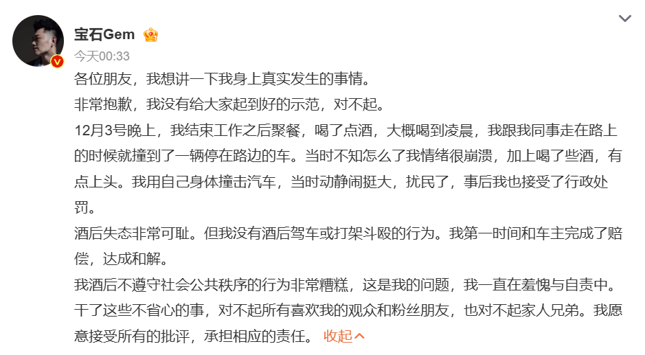 12月27日凌晨,知名说唱歌手“宝石老舅”发文道歉,回应“醉酒拘留”传闻。相关话题冲上热搜第一:他表示,12月3号晚上,他结束工作之后聚餐喝了点酒,跟同事走在路上撞到了一辆停在路边的车。“当时不知怎么
