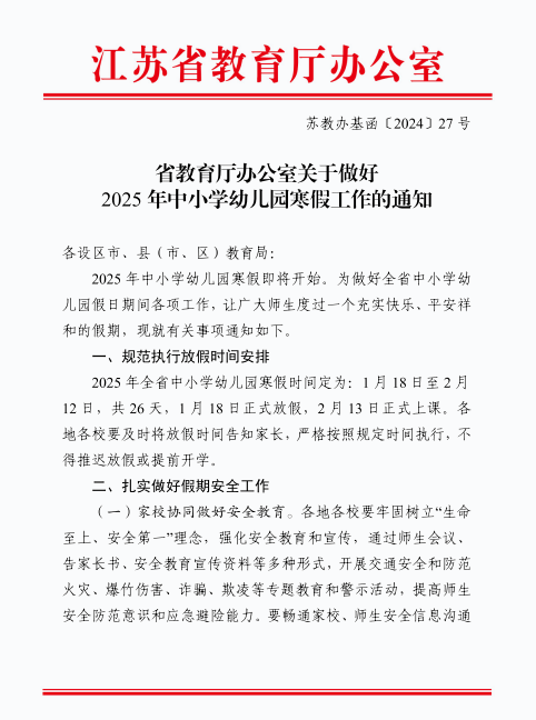 江苏省教育厅发布关于做好2025年中小学幼儿园寒假工作的通知根据通知2025年全省中小学幼儿园寒假时间定为1月18日至2月12日共26天1月18日正式放假2月13日正式上课具体通知内容如下一、规范执行