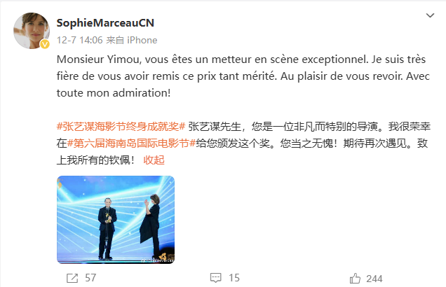 近日,第六届海南岛国际电影节上,苏菲·玛索为张艺谋颁发终身成就奖。张艺谋表示:“特别荣幸从苏菲·玛索手里领得这个奖项,我记得我在北京电影学院读书的时候,看她的电影。苏菲·玛索是我长期以来心中的女神。”