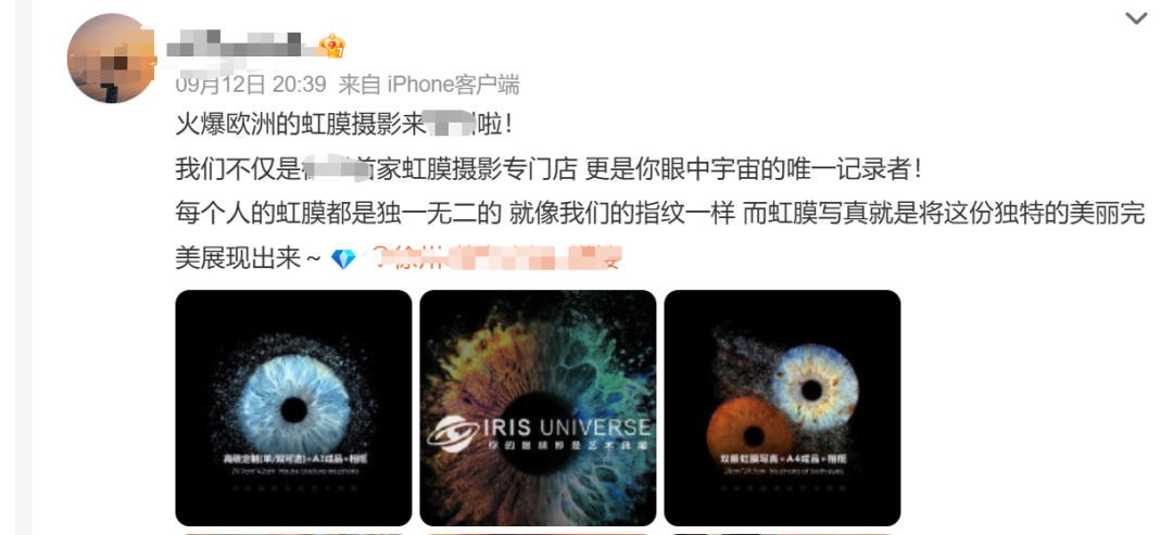 最近,一种新兴的“虹膜写真”在市场上兴起还有不少网友及商家在社交媒体发布相关照片据媒体报道虹膜写真的拍摄方法与在医院检查眼睛类似首先顾客要将下巴放置在一个托盘上两侧强光会将瞳孔照亮再由处于正面的一台相