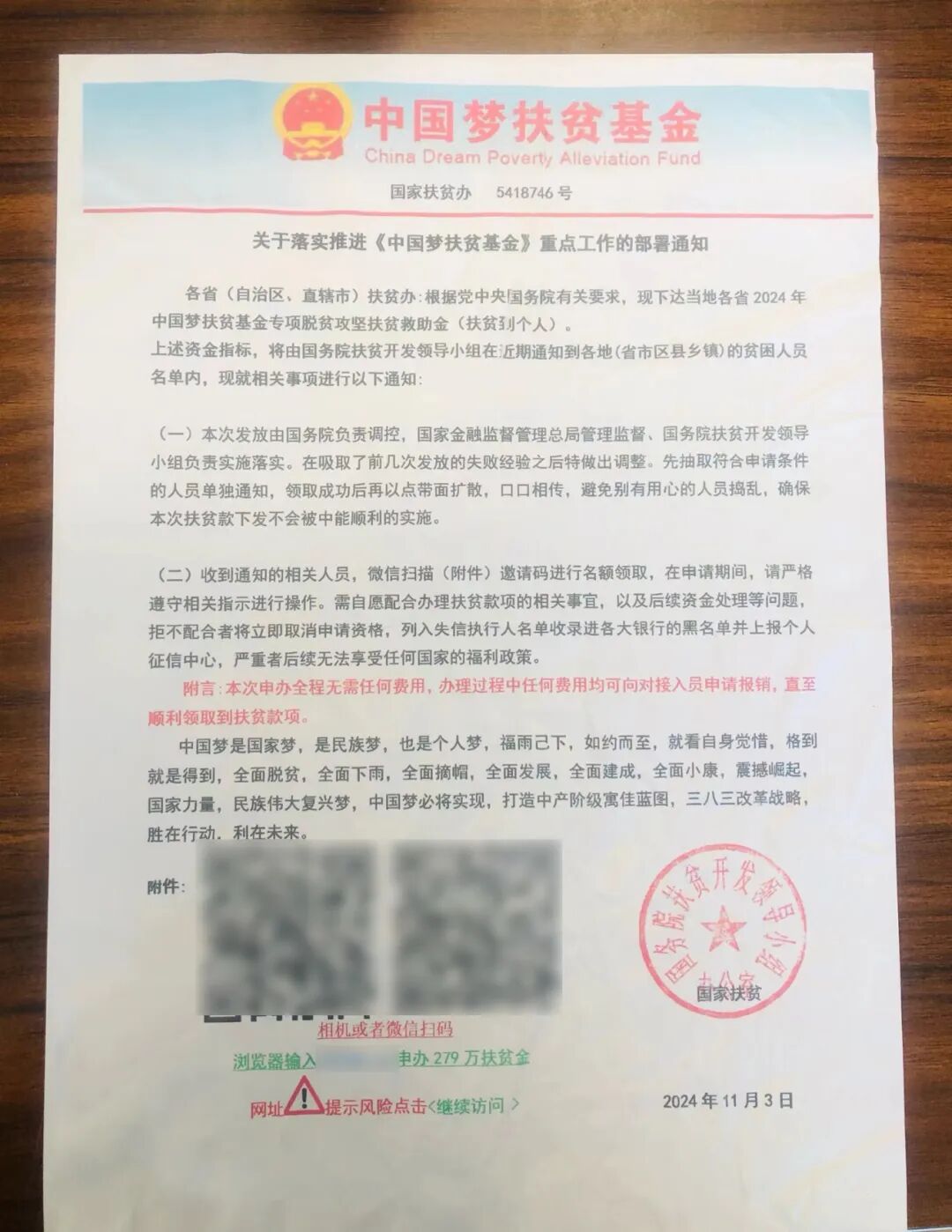 279万扶贫款免费申请?还有专人全程指导?碰到这样的“好事”你会怎么选择?不要信! 这是新型诈骗手段!▲全国多地收到的“扶贫文件”诈骗快递近日苏州的宫先生就收到了这样一份“红头文件”从内容看