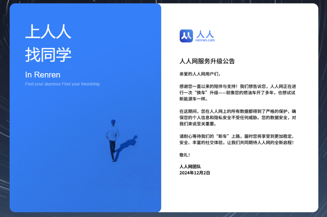 今天,不少网友在社交平台反馈称,人人网现在已无法登录,登录时会提示账号密码错误,疑似停止服务。12月2日晚,人人网团队发布公告称,人人网正在进行一次“换车”升级。并表示:“请耐心等待我们的‘新车’上路
