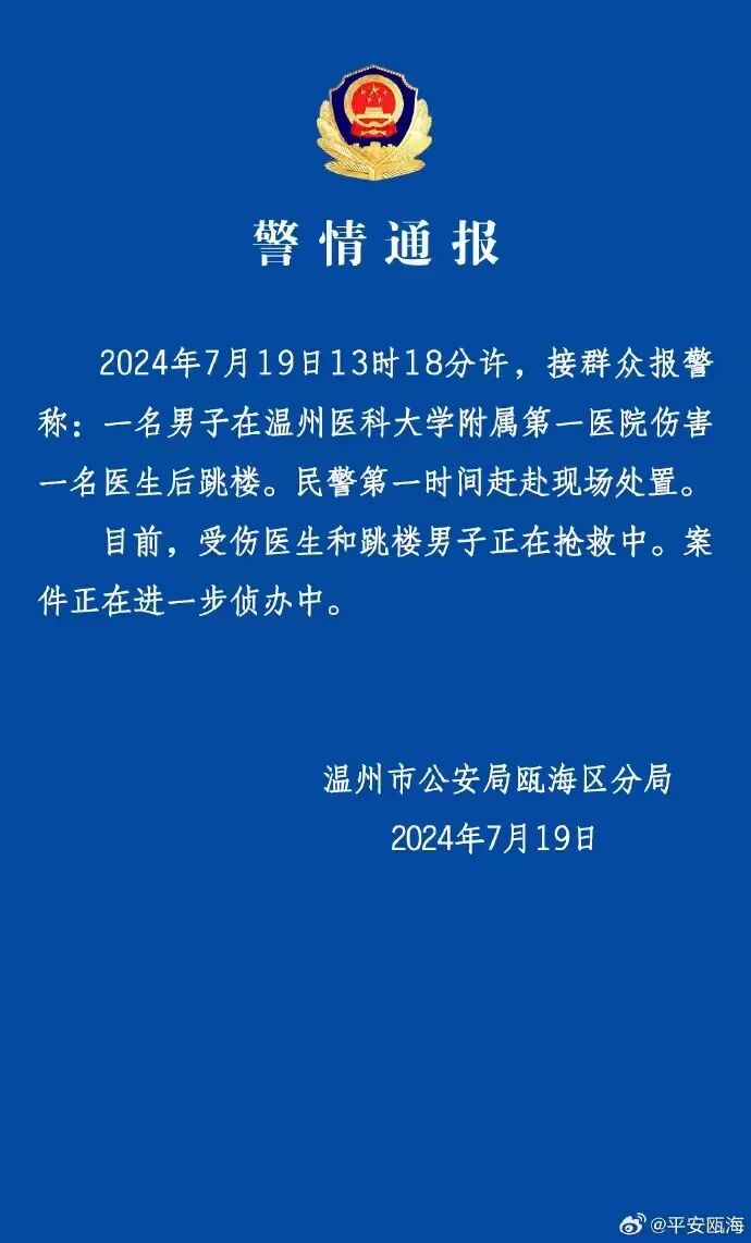 7月20日凌晨,温州医科大学附属第一医院官方微信公众号发布悼文《沉痛悼念李晟医生》:2024年7月19日中午13时许,我院心血管内科李晟医生在门诊诊疗中,突然遭到一男子持刀伤害,致多处严重损伤。事发后