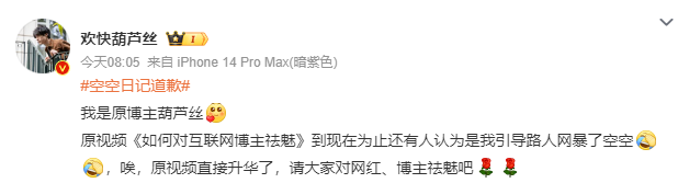 7月19日,据津云报道,近日,网红博主“空空日记”发布视频道歉,承认直播时对素人有过谩骂的行为,因为没控制好自己的情绪,暴露出素人头像和网名截图。今后会努力提升个人素质,规范自己的言行,向喜欢和监督自