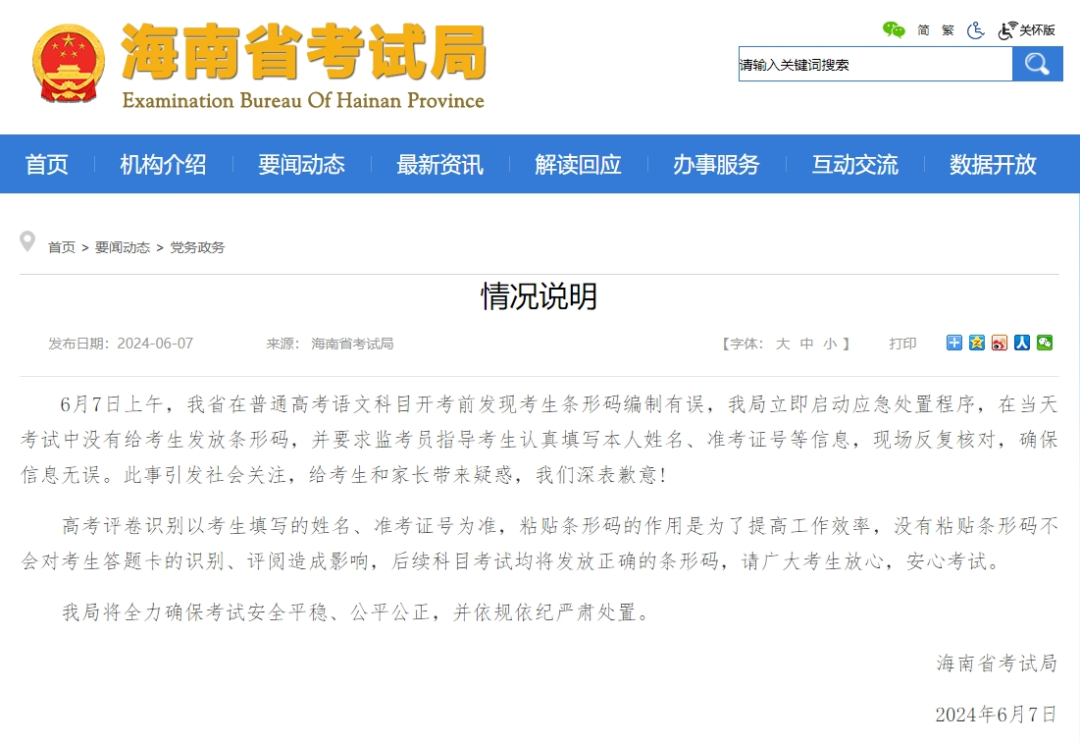 6月7日,网传海南省语文考试中没有发放条形码,引发关注。当晚,海南省考试局发布情况说明,具体情况一起来看看!通报全文↓↓↓6月7日上午,我省在普通高考语文科目开考前发现考生条形码编制有误,我局立即启动