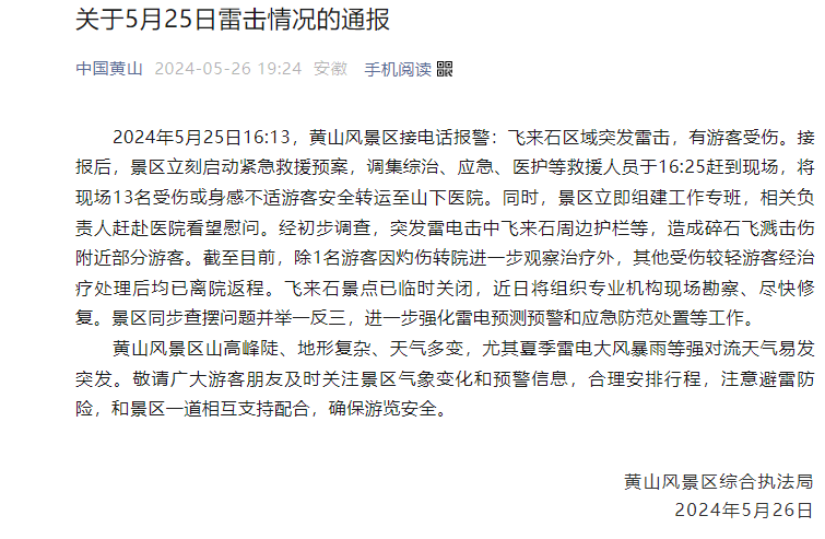 5月25日多名游客反映安徽黄山景区内发生雷击致多人受伤事件引关注刚刚中国黄山发布关于5月25日雷击情况的通报情况通报如下:▼此前报道25日13时12分,黄山气象管理处官方微博“黄山旅游气象”发布消息称