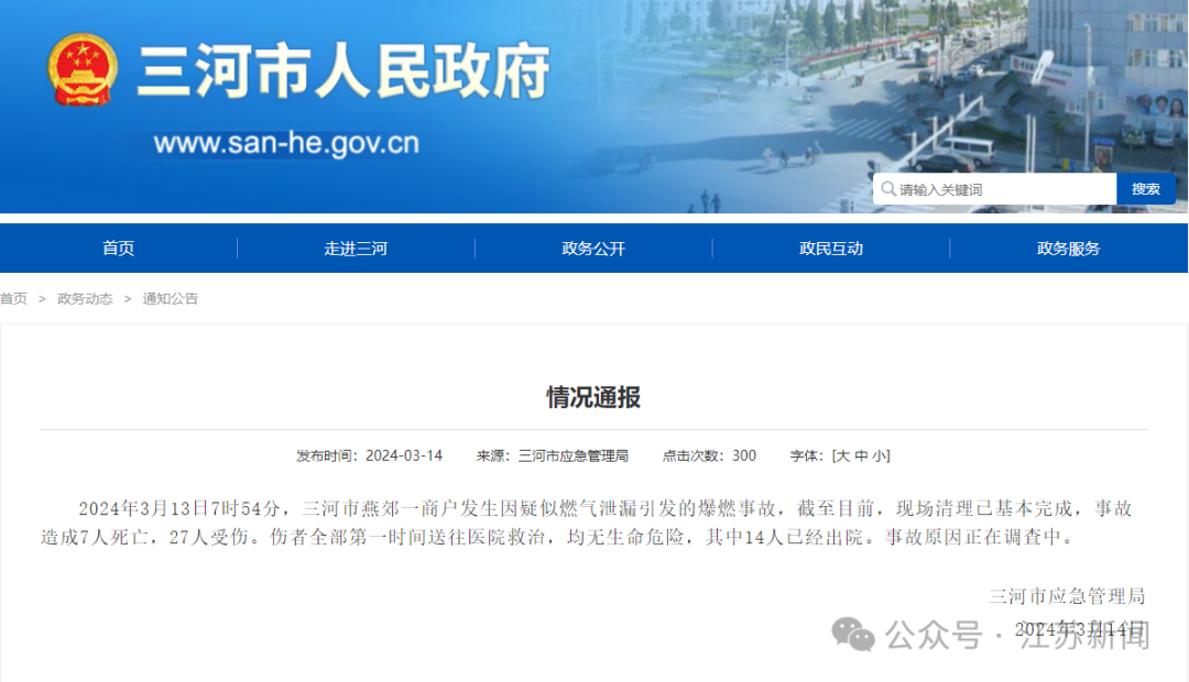 河北省三河市应急管理局14日凌晨发布情况通报称,2024年3月13日7时54分,三河市燕郊一商户发生因疑似燃气泄漏引发的燃爆事故,截至目前,现场清理已基本完成,事故造成7人死亡,27人受伤。伤者全部第